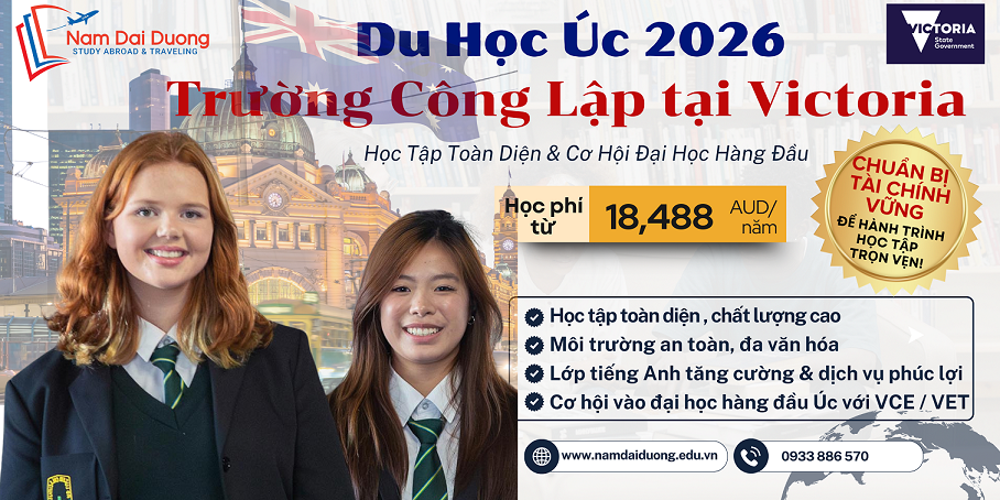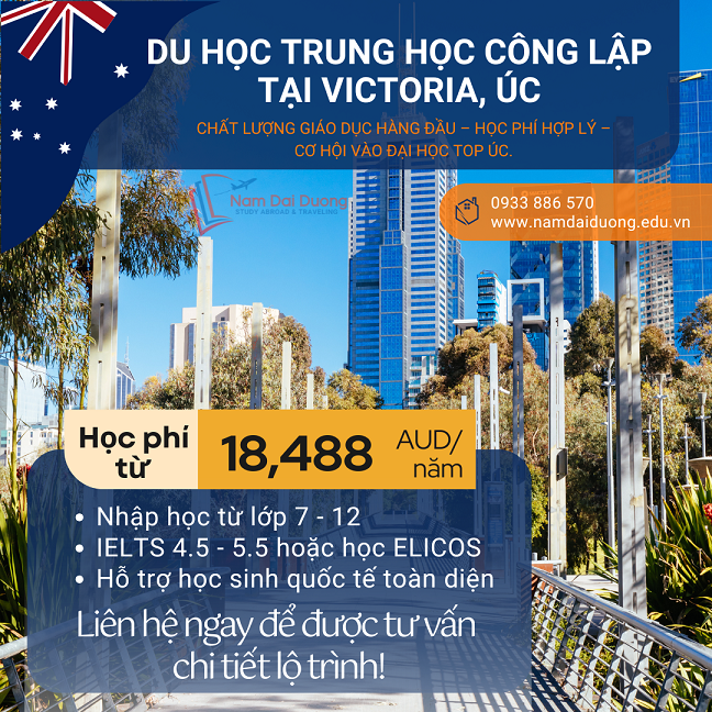 ** Quý phụ huynh, học sinh cần hỗ trợ giải đáp thông tin về chương trình trung học tại hệ thống trường công lập bang Victoria – hồ sơ du học Úc, học bổng du học Úc, chuẩn bị hồ sơ và thủ tục du học Úc,….liên hệ ngay Nam Đại Dương để được hướng dẫn lộ trình học chuẩn ngay từ bây giờ để phù hợp với tài chính và thế mạnh của từng học sinh nhé.