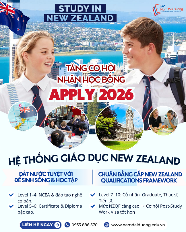 Thông tin tư vấn về trường du học New Zealand – học bổng du học New Zealand – thủ tục xin visa du học New Zealand, liên hệ cùng Nam Đại Dương, sẽ luôn đồng hành cùng bạn và hỗ trợ hoàn tất thủ tục nhập học, các bạn sẽ tự tin mở cánh cửa vào các trường chất lượng tại New Zealand.