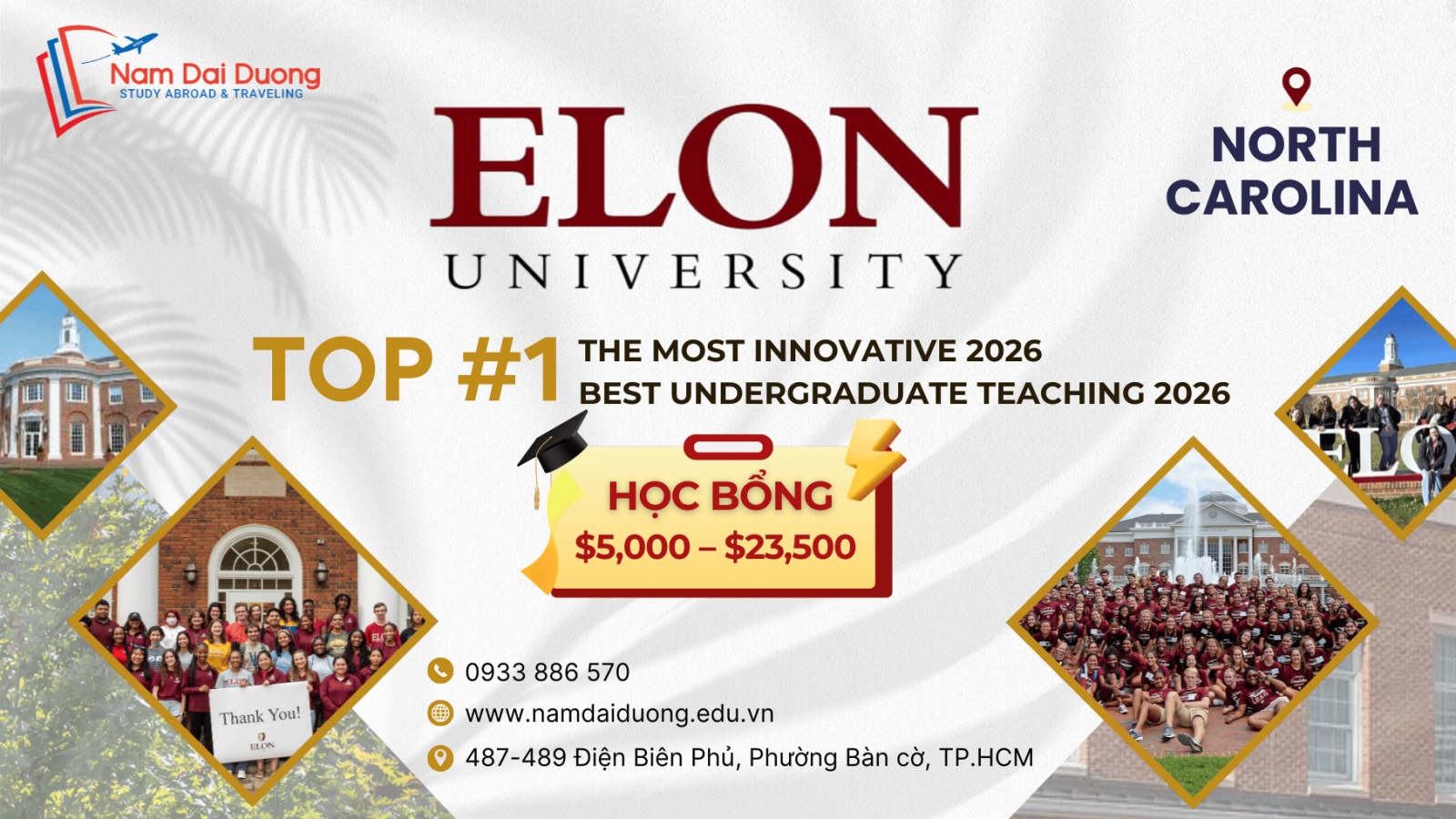 Hãy đến học tập tại Elon University để viết nên chương mới của tương lai – nơi tri thức và cơ hội để bạn vươn tầm thế giới.