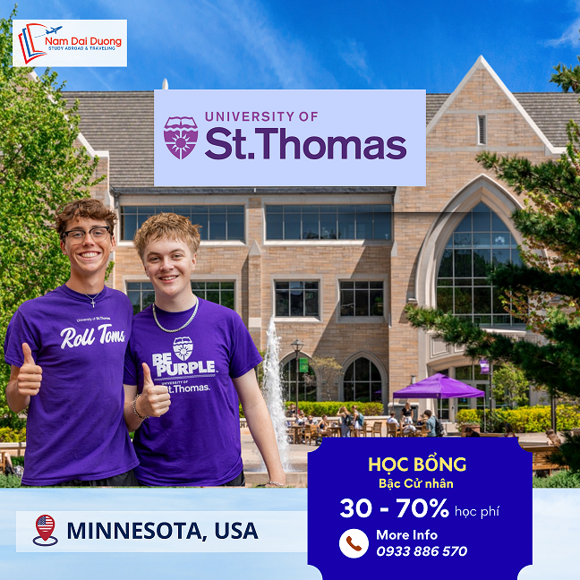 University of St. Thomas là trường Đại học danh tiếng tại bang Minnesota, Hoa Kỳ. Với hơn 6.000 sinh viên bậc Cử nhân và 500+ sinh viên quốc tế đến từ 80+ quốc gia. Bang Minnesota có 17 công ty nằm trong danh sách Fortune 500 đặt trụ sở quốc tế.