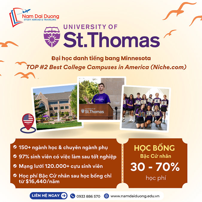 ** Quý phụ huynh, học sinh cần hỗ trợ giải đáp thông tin về trường University of St. Thomas – hồ sơ du học Mỹ, học bổng du học Mỹ, chuẩn bị hồ sơ và thủ tục du học Mỹ,….liên hệ ngay Nam Đại Dương để được hướng dẫn lộ trình học chuẩn ngay từ bây giờ để phù hợp với tài chính và thế mạnh của từng học sinh.