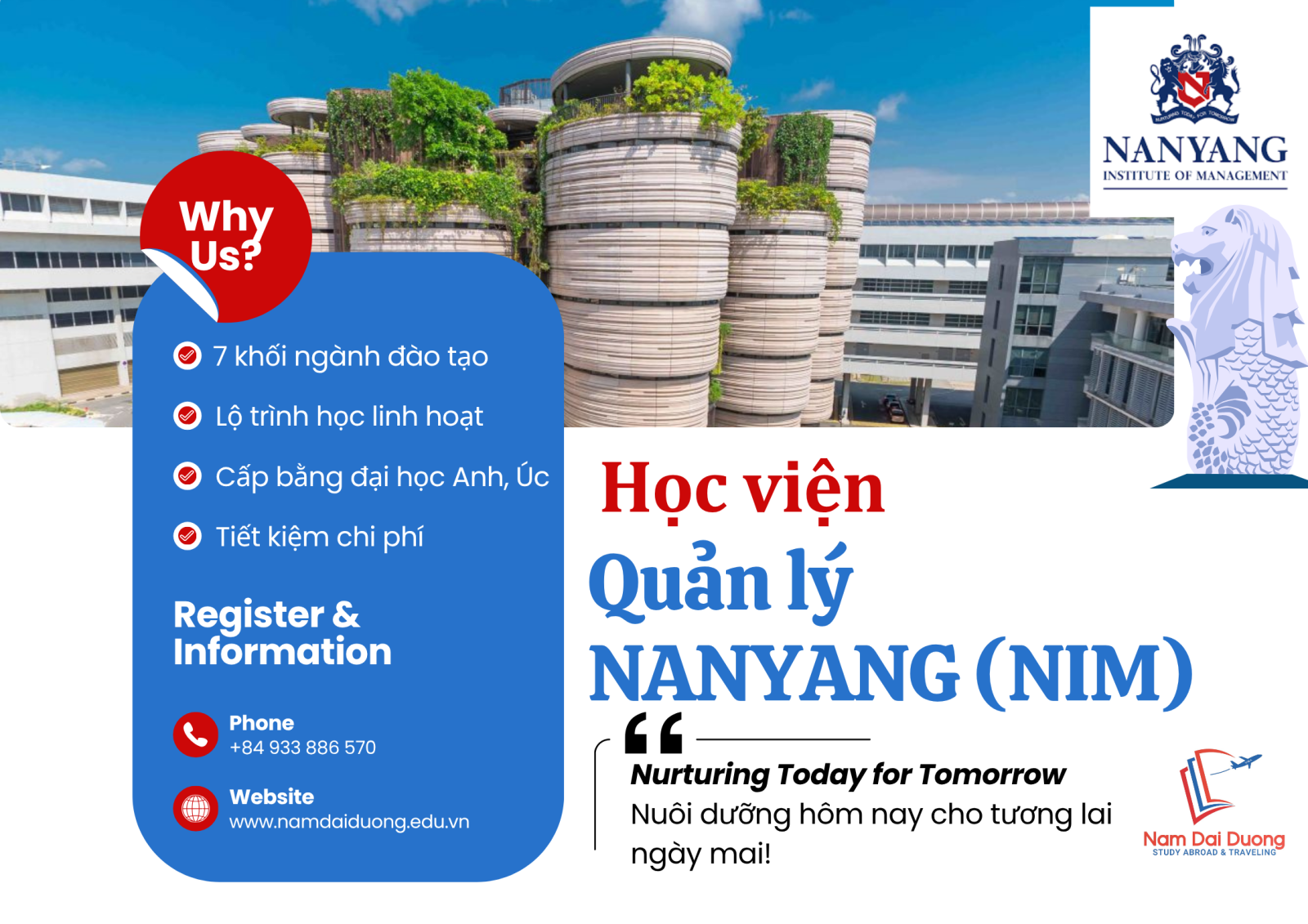 Nanyang Institute of Management (NIM) – Học viện Quản lý Nanyang, được thành lập năm 2001, là một trong những học viện tư thục danh tiếng tại Singapore. Với triết lý giáo dục “Nurturing Today for Tomorrow – Nuôi dưỡng hôm nay cho tương lai ngày mai”, NIM chú trọng đào tạo thế hệ sinh viên có năng lực chuyên môn, kỹ năng thực tiễn và tư duy toàn cầu.