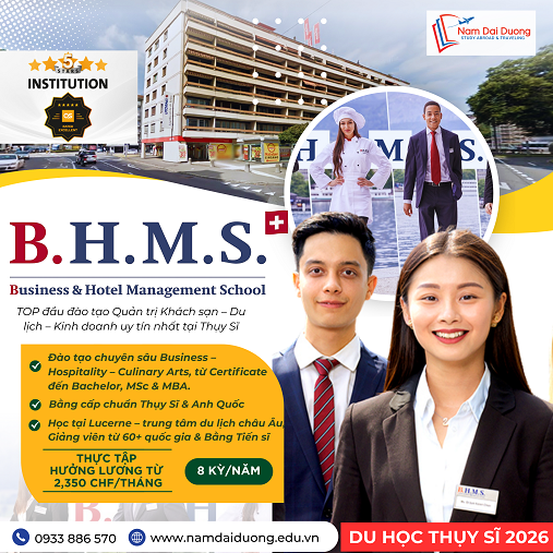 Business & Hotel Management School (BHMS) là một trong những trường TOP đầu đào tạo Quản trị Khách sạn – Du lịch – Kinh doanh uy tín tại Thụy Sĩ, tọa lạc ngay trung tâm thành phố Lucerne – trái tim du lịch châu Âu.