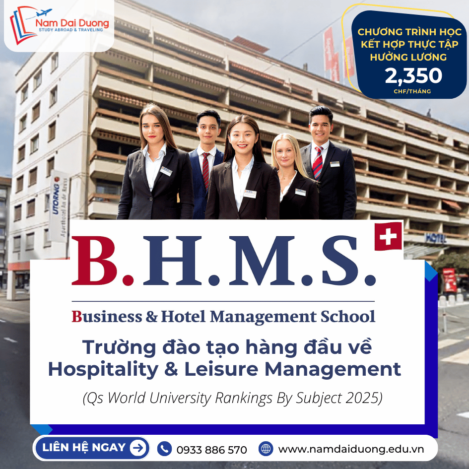 + Business & Hotel Management School (BHMS) với chương trình đào tạo chuẩn Thụy Sĩ – Anh quốc trong lĩnh vực Kinh doanh – Khách sạn – Du lịch – Ẩm thực. Cùng mạng lưới doanh nghiệp đối tác toàn cầu với mức thực tập hưởng lương 2,350 CHF cho sinh viên.